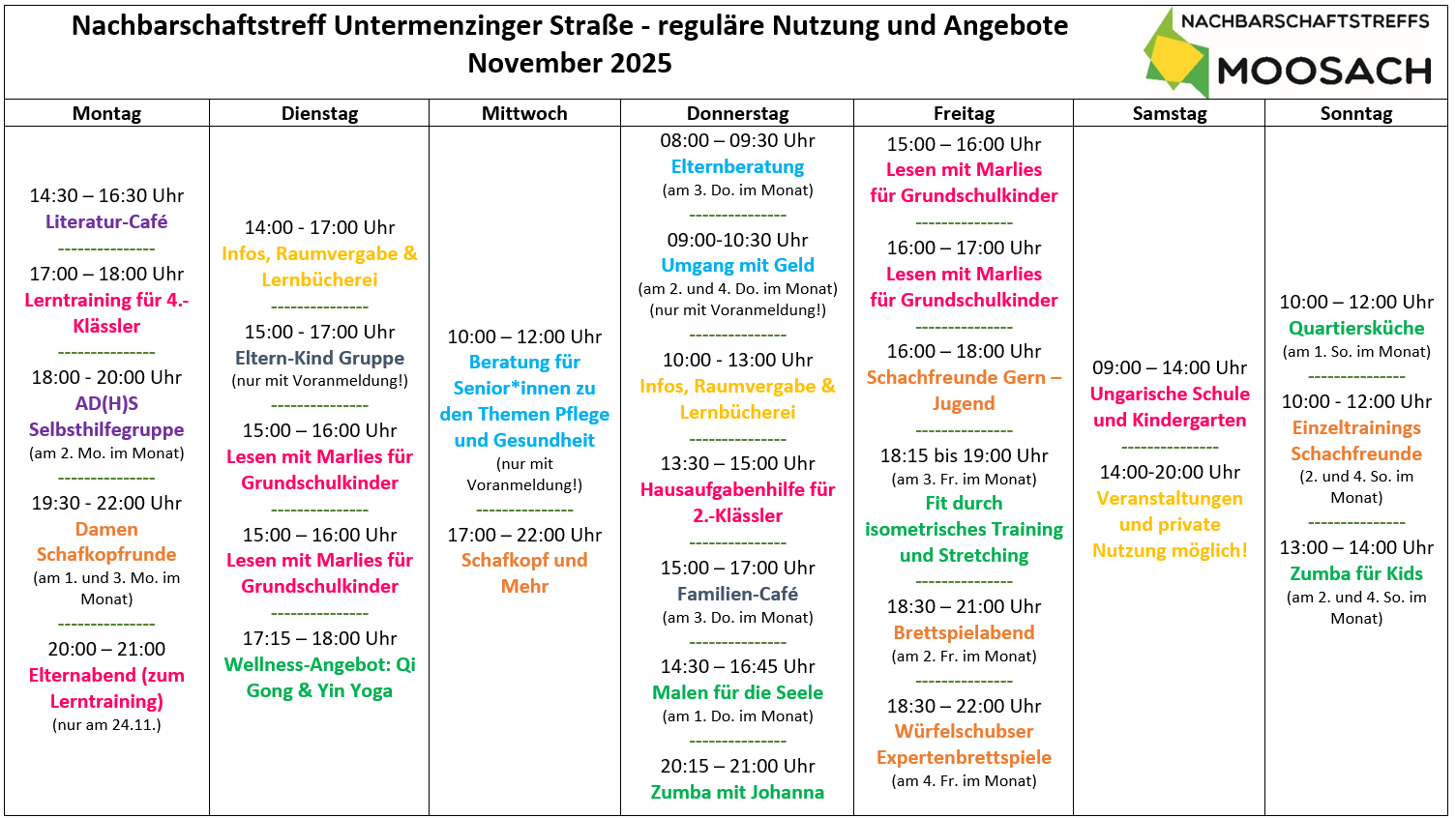 Unsere Gruppen, Angebote und Möglichkeiten zur privaten Raumnutzung für den November 2025: