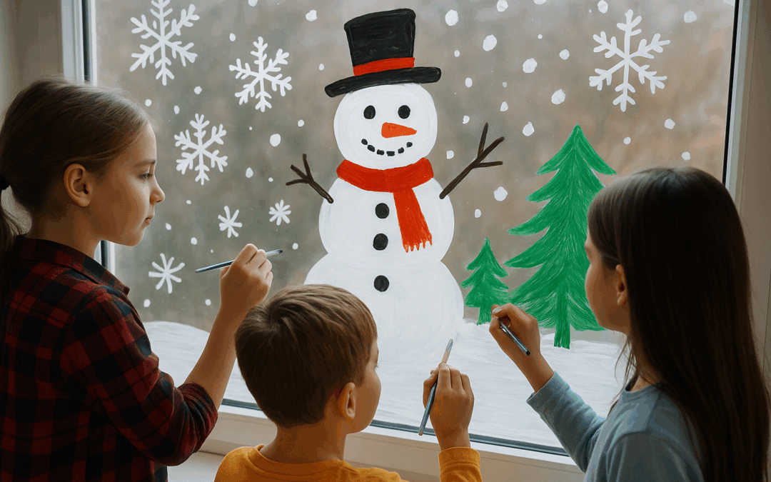 An verschiedenen Stationen können Kerzen bemalt, Holzfiguren gestaltet und Weihnachtskarten gebastelt werden. Das Highlight: Gemeinsam mit der Künstlerin Julia Khramtsova gestalten wir ein großes Winterfenster!